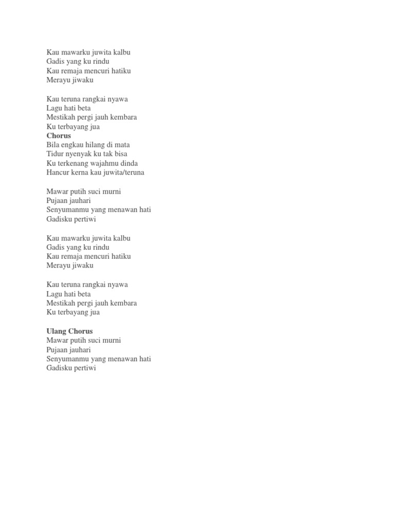 Kau mawarku Juwita kalbu Gadis yang ku rindu Kau remaja menawan hatiku Merayu jiwaku. LIRIK LAGU INDONESIA LAGU INTERNASIONAL BERITA.